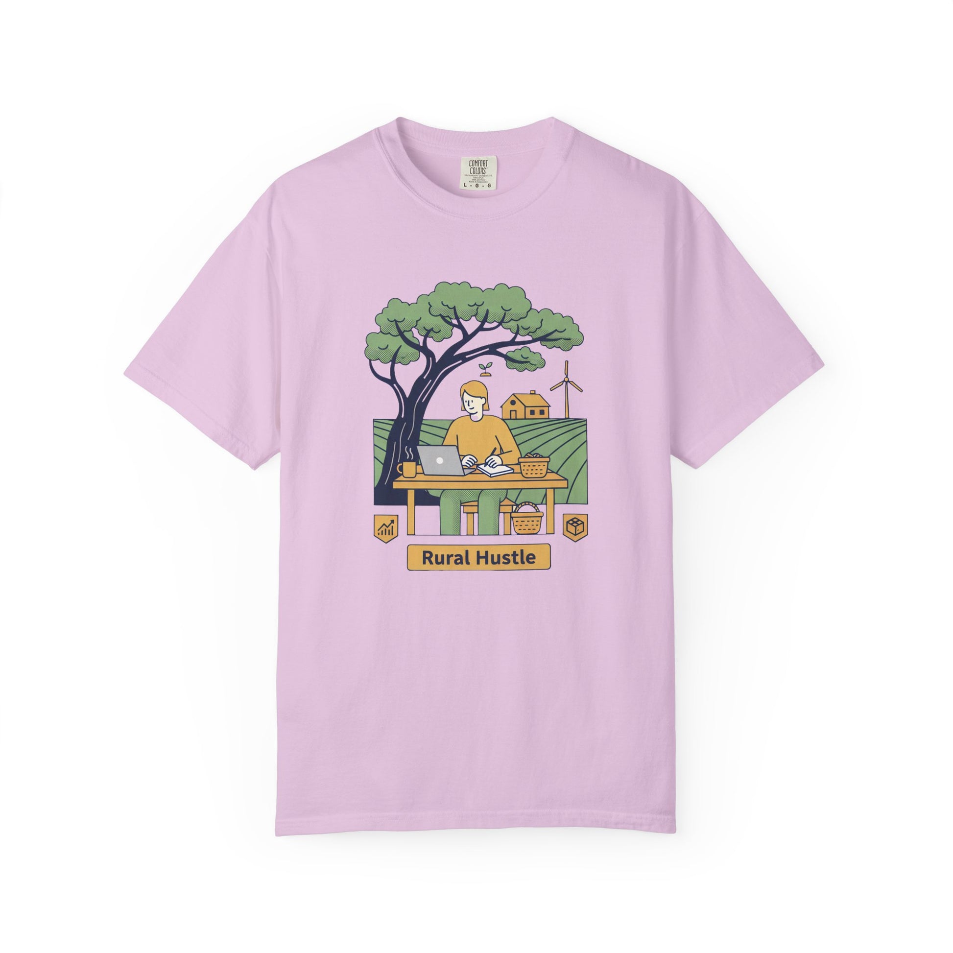 A relaxed, garment-dyed cotton tee that feels like a slow morning on the porch. The illustration—an earnest figure working at a wooden bench under a wide tree with fields, a barn, and a windmill behind—carries a quiet, self-reliant energy: ‘Rural Hustle.’ It sits on a heavyweight, soft-to-touch fabric that holds color beautifully and wears-in, not out. The roomy fit and durable double-needle seams make this shirt a dependable companion for hands-on days: put it on, get to work, and know it will age into a comfortable favorite. Available in many colors, sizes S–4XL, and finished with a sewn-in label for a clean feel.